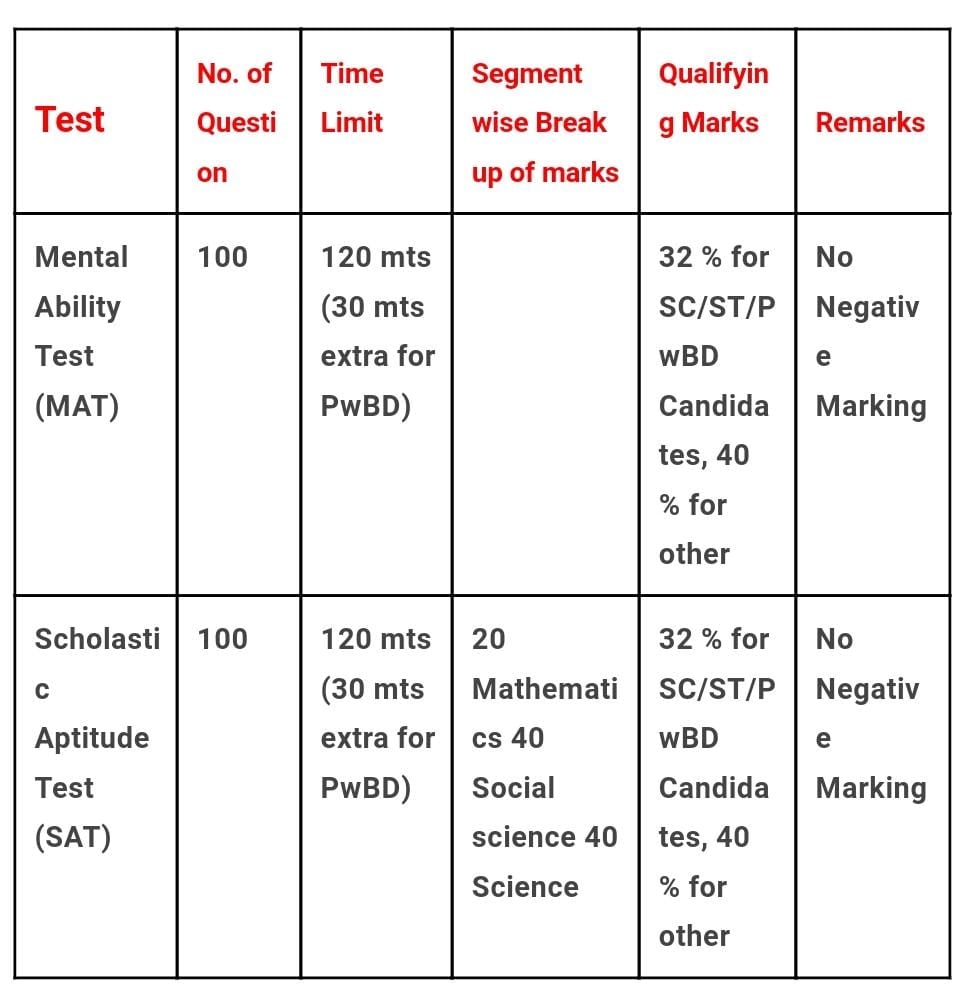 സ്കോളാസ്റ്റിക് അഭിരുചി പരീക്ഷിക്കുന്നതിന്, ഒമ്പതാം ക്ലാസിലെ സോഷ്യൽ സയൻസ്, മാത്തമാറ്റിക്സ്, സയൻസ് വിഷയങ്ങളിലെ എല്ലാ അധ്യായങ്ങളിൽ നിന്നും പത്താം ക്ലാസിലെ ഒന്നും രണ്ടും ടേം ഭാഗങ്ങളിൽ നിന്നുള്ള ചോദ്യങ്ങൾ ആദ്യ ഘട്ട പരീക്ഷയിൽ ഉണ്ടാകും.