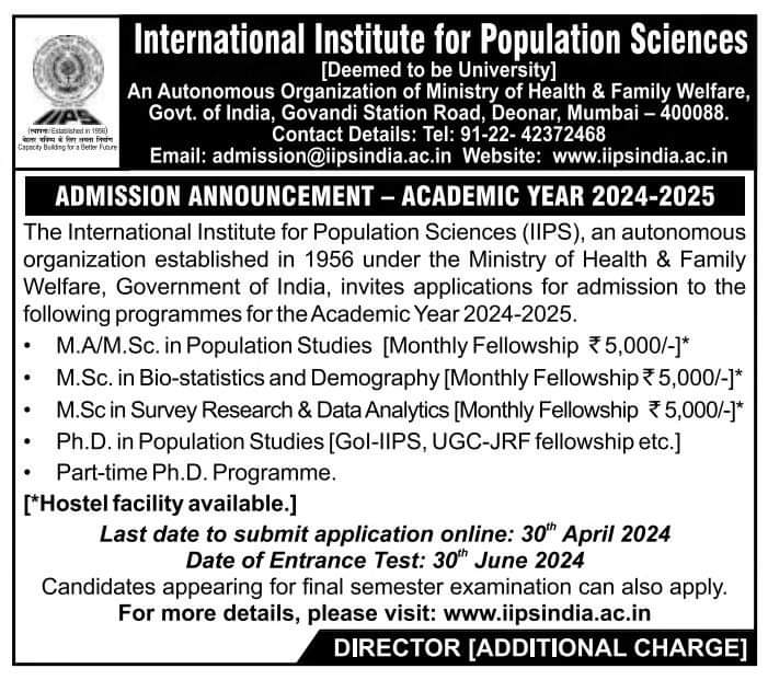 The International Institute for Population Sciences (IIPS) in Mumbai is inviting applications for admission to its M.A/M.Sc. and Ph.D. programs in Population Studies, Biostatistics and Demography, Survey Research & Data Analytics for the academic year 2024-2025. The last date to apply online is April 30, 2024. The entrance test will be held on June 30, 2024. For more details, please visit the IIPS website: https://www.iipsindia.ac.in/.