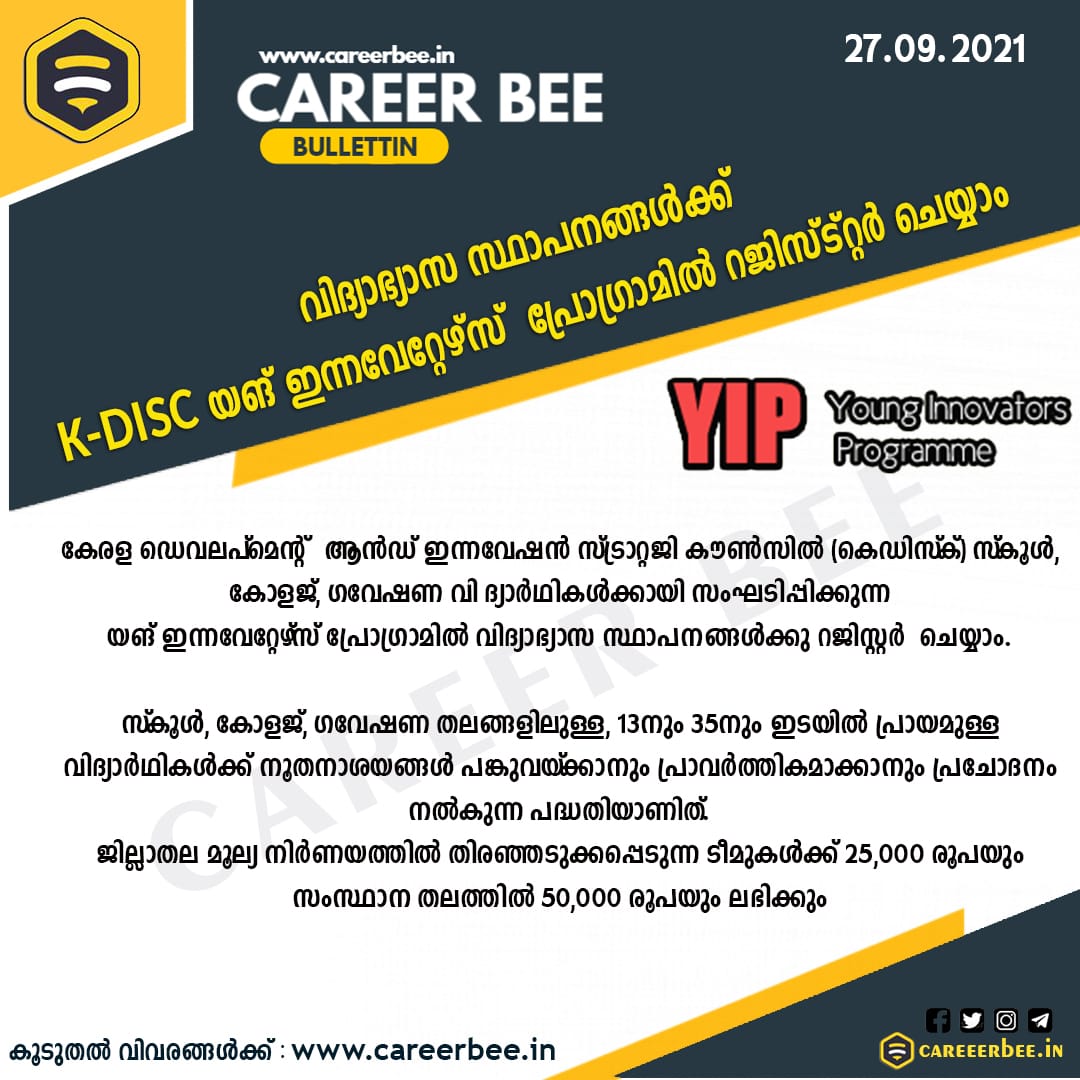 കേരള ഡെവലപ്മെന്റ് ആൻഡ് ഇന്നവേഷൻ സ്ട്രാറ്റജി കൗൺസിൽ (കെഡിസ്ക്) സ് കൂൾ, കോളജ്, ഗവേഷണ വി ദ്യാർഥികൾക്കായി സംഘടിപ്പിക്കു ന്ന ‘യങ് ഇന്നവേറ്റേഴ്സ് പ്രോഗ്രാമിൽ’ വിദ്യാഭ്യാസ സ്ഥാപനങ്ങൾക്കു റജിസ്റ്റർ ചെയ്യാം.