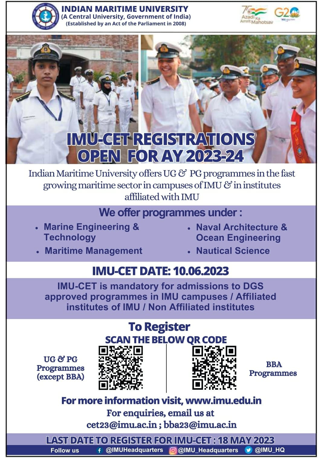 വിവിധ യുജി (ബിബിഎ ഒഴികെ) പ്രോഗ്രാമുകളിലേക്കുള്ള പ്രവേശനം IMU-CET 2023 അല്ലെങ്കിൽ CUET(UG) 2023 വഴിയായിരിക്കും