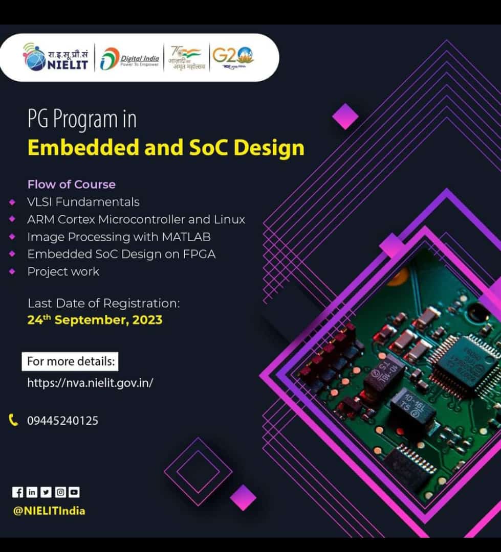 എംബഡഡ് സിസ്റ്റങ്ങളിലും SoC ഡിസൈനിലും പ്രതിഫലദായകമായ കരിയറിൽ താൽപ്പര്യമുണ്ടെങ്കിൽ, NIELIT-ലെ പിജി പ്രോഗ്രാം ഇൻ എംബഡഡ് ആൻഡ് സോക് ഡിസൈൻ ഒരു മികച്ച ഓപ്ഷനാണ്. വിദ്യാർത്ഥികൾക്ക് ഏറ്റവും പുതിയ സാങ്കേതികവിദ്യകളിൽ സമഗ്രമായ വിദ്യാഭ്യാസവും ഈ വേഗത്തിൽ വളരുന്ന മേഖലയിൽ വിജയിക്കാൻ ആവശ്യമായ കഴിവുകൾ വികസിപ്പിക്കാനുള്ള അവസരവും പ്രോഗ്രാം വാഗ്ദാനം ചെയ്യുന്നു.