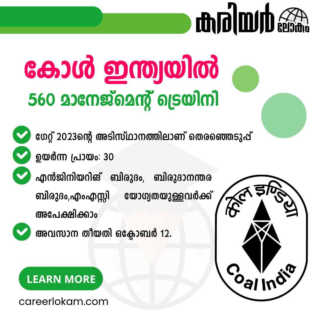 പൊതുമേഖലാ സ്ഥാപനമായ കോൾ ഇന്ത്യ ലിമിറ്റഡിൽ മാനേജ്മെന്റ് ട്രെയിനി തസ്തികയിലേക്ക് 560 ഒഴിവ് പ്രഖ്യാപിച്ചു. ഓരോ വിഭാഗത്തിലും ഒഴിവുകളുടെ എണ്ണം ഇപ്രകാരമാണ്: