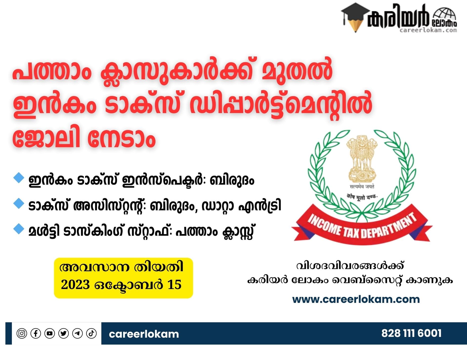 ഇൻകം ടാക്സ് ഡിപ്പാർട്ട്മെന്റിൽ ജോലി അവസരം