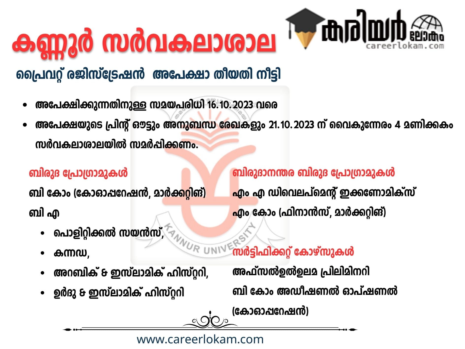 കണ്ണൂർ സർവകലാശാല പ്രൈവറ്റ് രജിസ്ട്രേഷൻ – അപേക്ഷാ തീയതി നീട്ടി