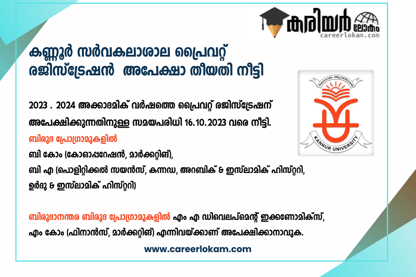 കണ്ണൂർ സർവകലാശാല പ്രൈവറ്റ് രജിസ്ട്രേഷൻ – അപേക്ഷാ തീയതി നീട്ടി