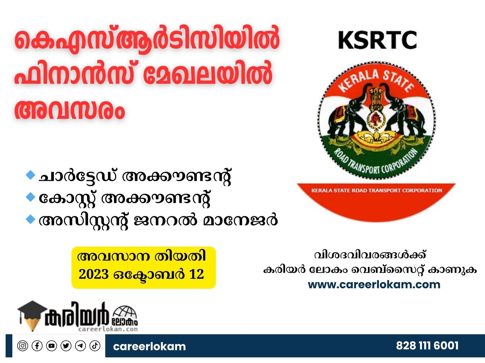 കെഎസ്ആർടിസിയിൽ ഫിനാൻസ് മേഖലയിൽ അവസരം അപേക്ഷ 12 വരെ