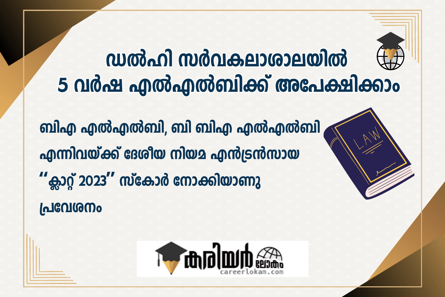 ഡൽഹി സർവകലാശാലയിൽ ഫാക്കൽറ്റി ഓഫ് ലോയുടെ കീഴിൽ പുതുതായി ആരംഭിച്ച 5 വർഷ എൽഎൽബിക്ക് അപേക്ഷ ക്ഷണിച്ചു. ബിഎ എൽഎൽബി, ബി ബിഎ എൽഎൽബി എന്നിവയ്ക്ക് ദേശീയ നിയമ എൻട്രൻസായ ‘ക്ലാറ്റ് 2023ലെ സ്കോർ നോക്കിയാണു പ്രവേശനം. പൊതുവിഭാഗത്തിൽ 1500 രൂപ യും എസ്ടി, എസി വിഭാഗങ്ങളിൽ 1000 രൂപയുമാണ് അപേക്ഷാ ഫീസ്.