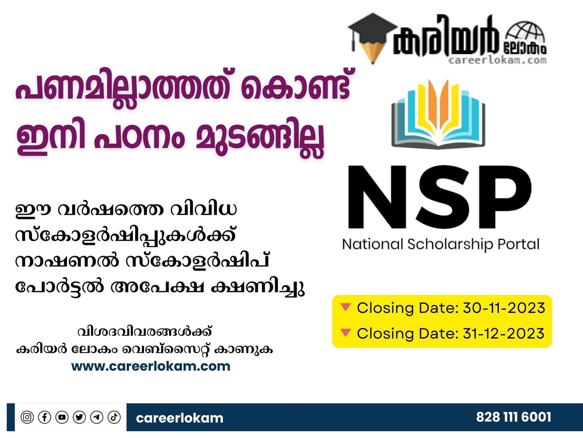 - വിദ്യാഭ്യാസത്തിന് സാമ്പത്തിക ബുദ്ധിമുട്ട് അനുഭവിക്കുന്ന വിദ്യാർത്ഥികൾക്ക് NSP വഴി ലഭ്യമായ വിവിധ സ്കോളർഷിപ്പുകൾക്ക് അപേക്ഷിക്കാം.