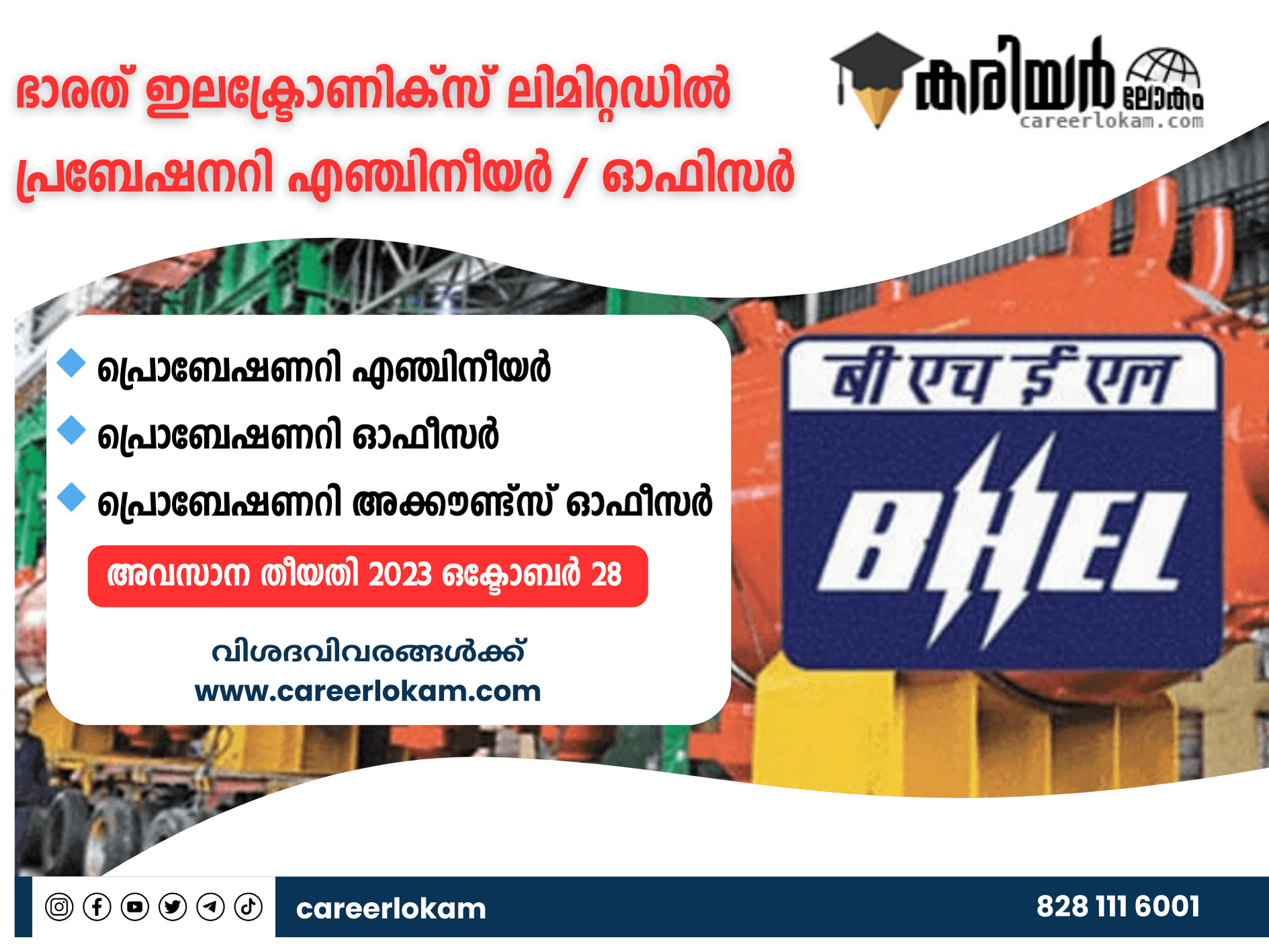 ഈ ജോലി അവസരം യോഗ്യരായ ഉദ്യോഗാർത്ഥികൾക്ക് ഒരു മികച്ച അവസരമാണ്. ഭാരത് ഇലക്ട്രോണിക്സ് ലിമിറ്റഡ് ഇന്ത്യയിലെ പ്രമുഖ പൊതുമേഖലാ സ്ഥാപനങ്ങളിലൊന്നാണെന്നും ഇത് ഉദ്യോഗാർത്ഥികൾക്ക് മികച്ച തൊഴിൽ സാധ്യതകൾ നൽകുന്നുവെന്നും കൂടി ശ്രദ്ധിക്കേണ്ടതാണ്.
