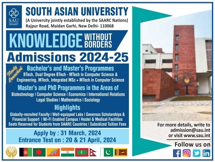 ദക്ഷിണേഷ്യൻ രാജ്യങ്ങളിലെ ഏറ്റവും മികച്ച യൂണിവേഴ്സിറ്റികളിൽ ഒന്നായ സൗത്ത് ഏഷ്യൻ യൂണിവേഴ്സിറ്റി (SAU) വിവിധ ബിരുദ, ബിരുദാനന്തര കോഴ്സുകളിലേക്ക് അപേക്ഷ ക്ഷണിക്കുന്നു.