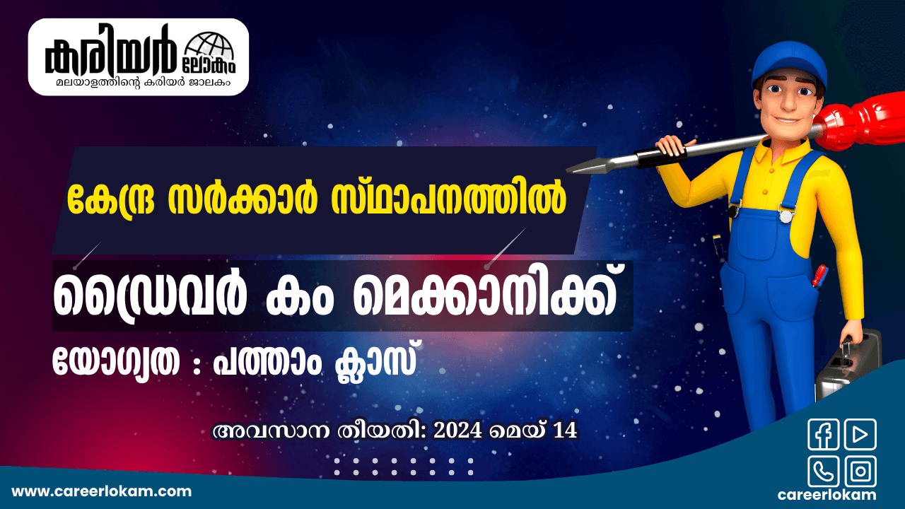 കേന്ദ്ര സർക്കാരിന്റെ കീഴിൽ ഡ്രൈവർ കം മെക്കാനിക്ക് തസ്തികയിൽ ജോലി നേടാം! പത്താം ക്ലാസ് പാസ്സായവർക്ക് അപേക്ഷിക്കാം