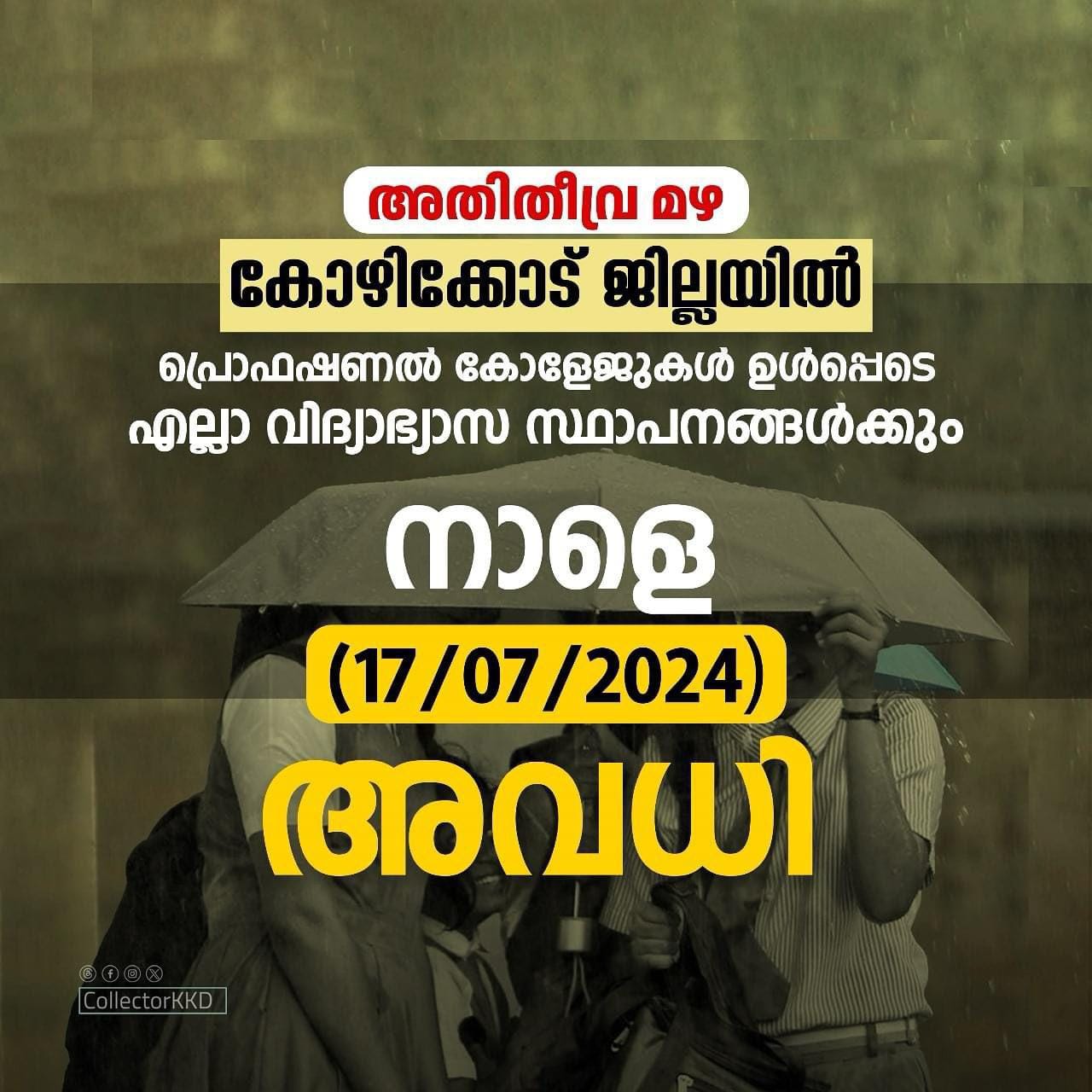 വയനാട്: ‘ജില്ലയില് കാലവര്ഷം ശക്തമായ സാഹചര്യത്തില് ട്യൂഷന് സെന്ററുകള്, അങ്കണവാടികള്, പ്രൊഫഷണല് കോളേജുകള് ഉള്പ്പെടെയുള്ള വിദ്യാഭ്യാസ സ്ഥാപനങ്ങള്ക്ക് നാളെ (ജുലായ് 17) അവധി പ്രഖ്യാപിച്ചു. എം.ആര്.എസ് സ്കൂളുകള്ക്ക് അവധി ബാധകമല്ല’ വയനാട് ജില്ലാ കളക്ടര് അറിയിച്ചു.
