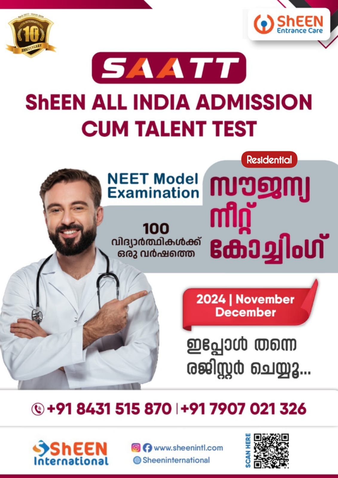 കേരളത്തിലെ വിദ്യാർത്ഥികൾക്ക് വലിയൊരു അവസരം ഒരുക്കിയിരിക്കുകയാണ് ഷീൻ ഇന്റർനാഷണൽ. 300-ലധികം വിദ്യാർത്ഥികൾക്ക് സൗജന്യ റെസിഡൻഷ്യൽ കോച്ചിംഗ് നൽകുന്ന പദ്ധതിയാണ് ആരംഭിച്ചിരിക്കുന്നത്. സൗജന്യമായി എൻട്രൻസ് റിപ്പീറ്റ് ബാച്ചിലേക്കും ഹൈസ്കൂൾ, ഹയർ സെക്കണ്ടറി റെസിഡൻഷ്യൽ ക്യാമ്പസിലേക്കും പ്രവേശനം നൽകാൻ 2024 നവംബർ, ഡിസംബർ മാസങ്ങളിൽ ഷീൻ ആൾ ഇന്ത്യ അഡ്മിഷൻ കം ടാലെന്റ് ടെസ്റ്റ് (SAAIT) സംഘടിപ്പിക്കുന്നു. അർഹത നേടുന്ന വിദ്യാർത്ഥികൾക്ക് എട്ടാം ക്ലാസ് മുതൽ ഉള്ള സ്കൂൾ റെഗുലർ പഠനവും ഒപ്പം NEET, JEE, CAT, CUET, CSE, CLAT, GATE, JEST തുടങ്ങിയ പ്രവേശന പരീക്ഷകൾ നേരിടാൻ പരിശീലനവും ലഭിക്കുന്നതാണ്.