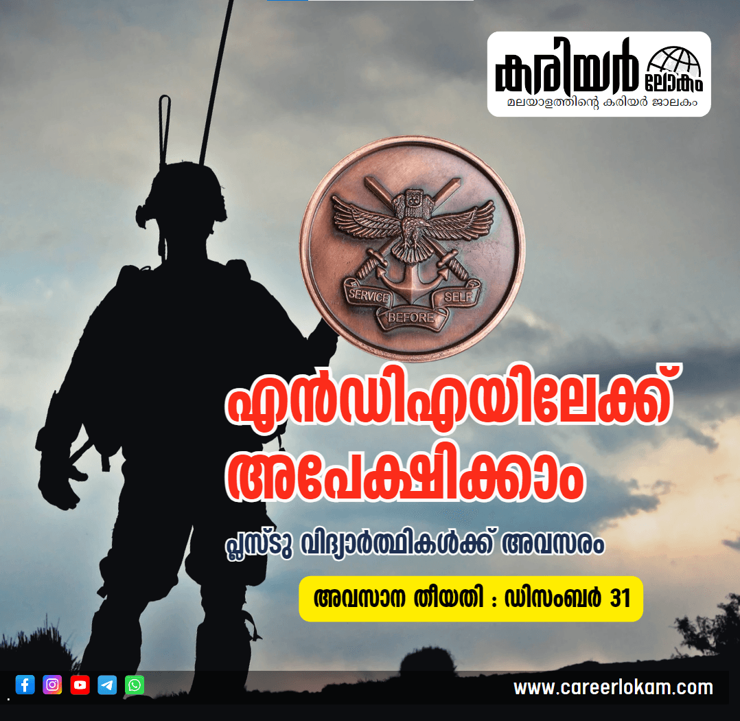 സൈനിക ജീവിതം ആഗ്രഹിക്കുന്ന പ്ലസ്ടു വിദ്യാർത്ഥികൾക്ക് വലിയൊരു അവസരമാണ് നാഷനൽ ഡിഫൻസ് അക്കാദമി (എൻഡിഎ). പുണെ നാഷനൽ ഡിഫൻസ് അക്കാദമി (എൻഡിഎ) ഉൾപ്പെടെയുള്ള സൈനിക അക്കാദമികളിൽ പ്രവേശനത്തിനുള്ള പരീക്ഷയ്ക്ക് അപേക്ഷിക്കാം. കരസേന, നാവികസേന, വ്യോമസേന എന്നീ വിഭാഗങ്ങളിൽ ഓഫീസറാകാനുള്ള അവസരമാണിത്.