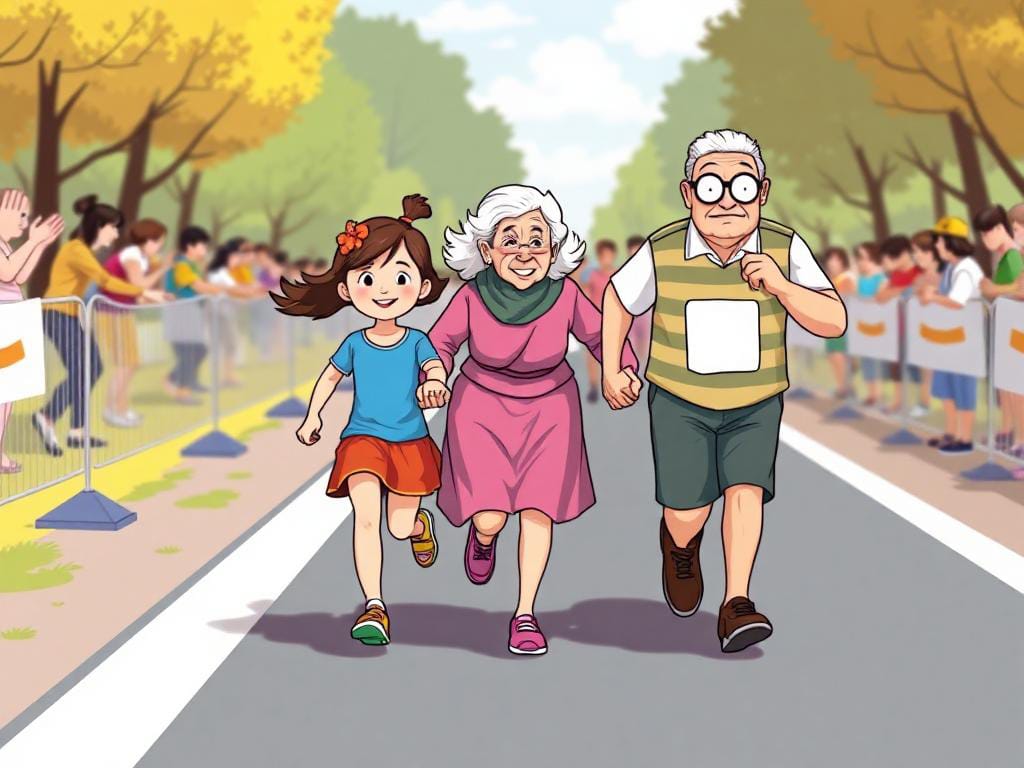 അവിടെയുണ്ടായിരുന്ന പ്രായമായ ഒരാൾ കൈ പൊക്കി. കുട്ടിക്കൊപ്പം മൽസരിച്ചോടാൻ അയാൾ രണ്ടുപേരെ നിർദേശിച്ചു. ഒരു അന്ധനും ഒരു വയോധികയുമായിരുന്നു അവർ. സകലരും അതുകണ്ട് അതിശയിച്ചു.