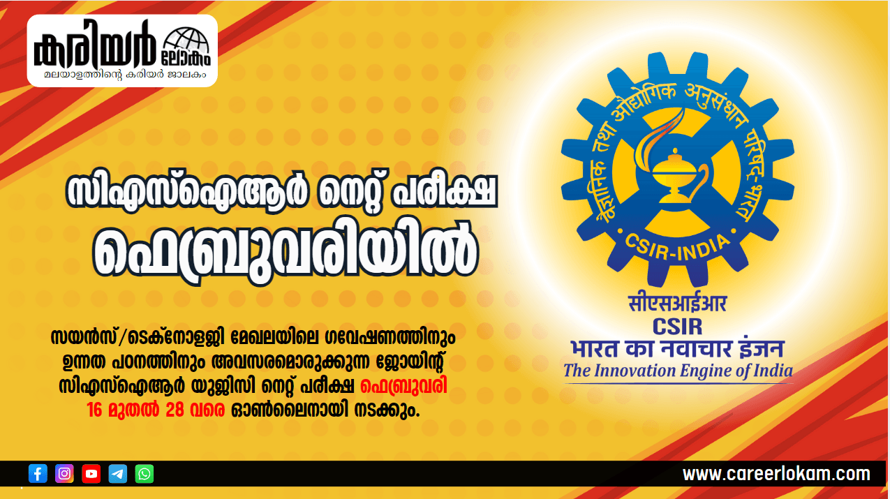 സയൻസ്/ടെക്നോളജി മേഖലയിലെ ഗവേഷണത്തിനും ഉന്നത പഠനത്തിനും അവസരമൊരുക്കുന്ന ജോയിന്റ് സിഎസ്ഐആർ-യുജിസി നെറ്റ് പരീക്ഷ ഫെബ്രുവരി 16 മുതൽ 28 വരെ ഓൺലൈനായി നടക്കും.