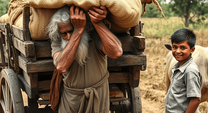 വൃദ്ധനായ കർഷകൻ ധാന്യം നിറച്ച ചാക്ക് കാളവണ്ടിയിൽ കയറ്റാൻ ശ്രമിക്കുകയാണ്……,