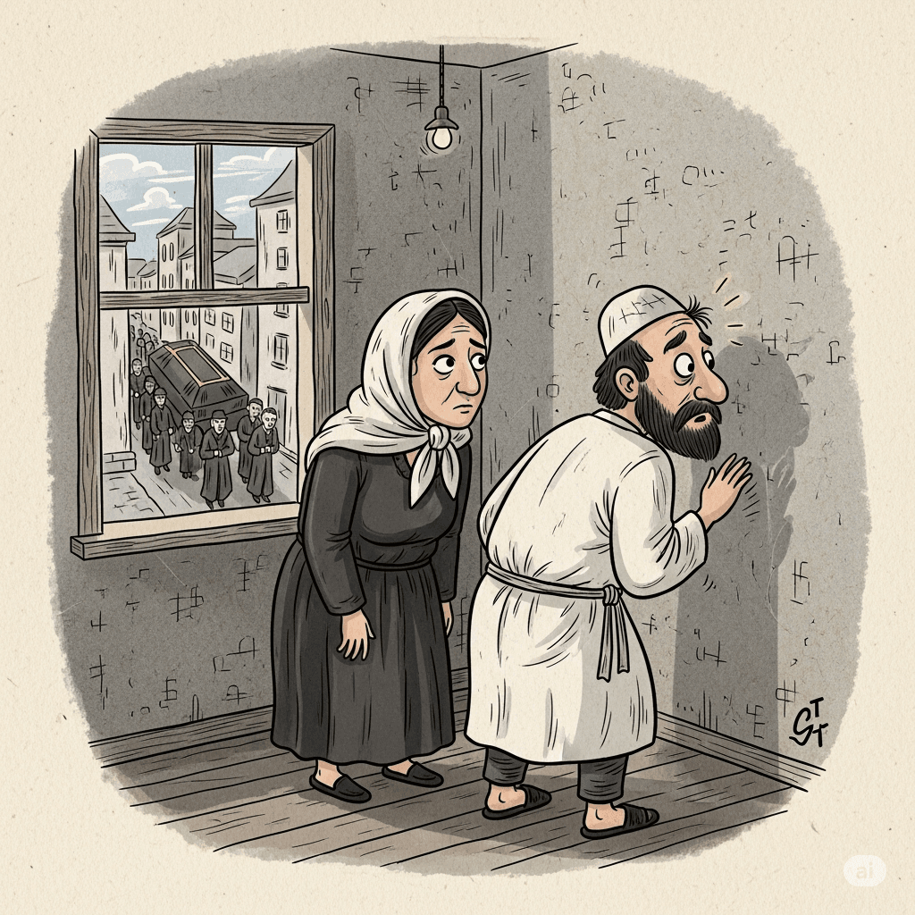 മുല്ല നസറുദ്ദീനും ഭാര്യയും വിശ്രമിക്കുകയാണ്. അവർ പരസ്പരം പുറംതിരിഞ്ഞിരിക്കുന്നു. ഭാര്യ പുറത്തേക്ക് നോക്കുമ്പോൾ മുല്ല ചുമരിലേക്ക് നോക്കുന്നു. പെട്ടെന്ന് ഭാര്യ പറഞ്ഞു: “നോക്ക്, നഗരത്തിലെ ഏറ്റവും പണക്കാരനായ ആൾ മരിച്ചു. അയാൾക്ക് അന്ത്യയാത്ര പറയാനായി ആയിരക്കണക്കിന് ജനങ്ങൾ പോയിക്കൊണ്ടിരിക്കുന്നു.”