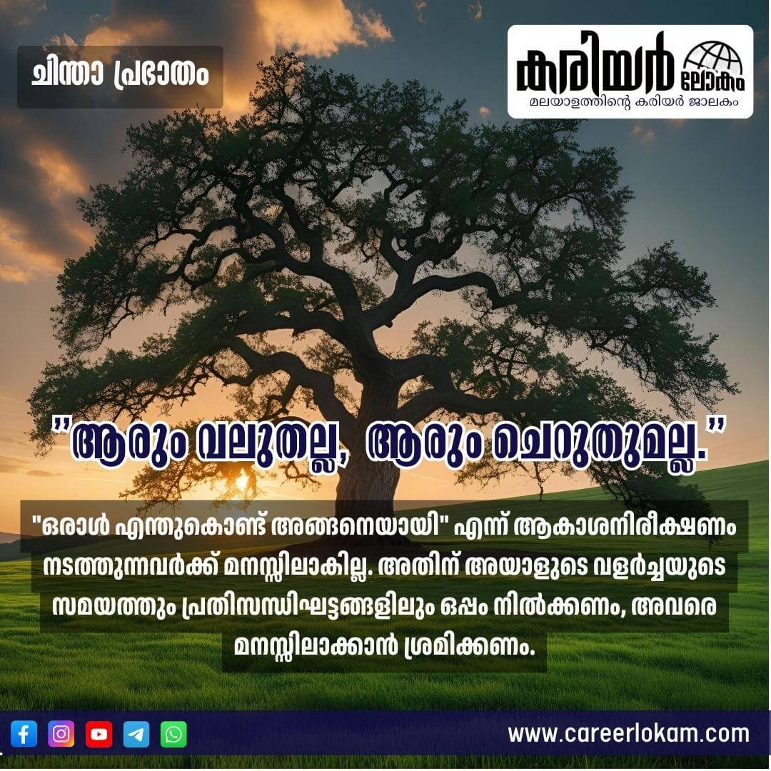 അതിനാൽ, ആരെയും ചെറുതായി കാണരുത്. കാരണം, ആരും വലുതല്ല, ആരും ചെറുതുമല്ല. ഓരോ വ്യക്തിക്കും അവരുടേതായ സവിശേഷതകളുണ്ട്. വിവേകമുള്ളവർ ആരുടെയും പുറംമോടി കണ്ട് വഞ്ചിതരാകില്ല. അവർ ആളുകളുടെ ഉള്ളിലെ കരുത്തും നന്മയും തിരിച്ചറിയുന്നു. സ്വാമി വിവേകാനന്ദൻ പറഞ്ഞതുപോലെ, “ഒരാളെയും ചെറുതായി കാണരുത്. നിങ്ങൾക്കറിയാത്ത ഒരു ശക്തി അവരിലുണ്ടാകാം.”