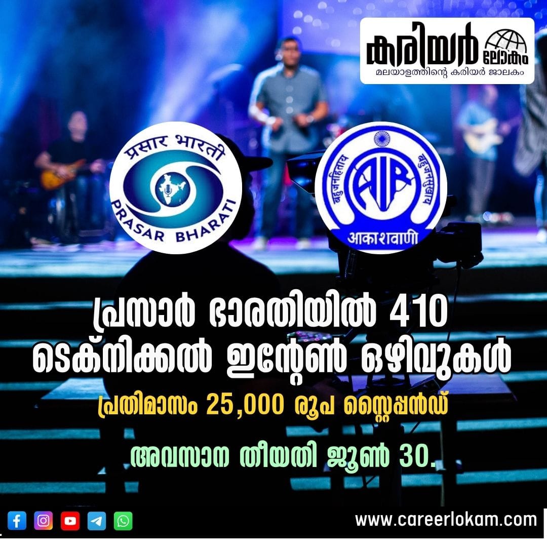 പ്രസാർ ഭാരതിയുടെ കീഴിലെ ആകാശവാണി, ദൂരദർശൻ കേന്ദ്രങ്ങളിൽ 410 ടെക്നിക്കൽ ഇൻ്റേൺ ഒഴിവുകൾ. എൻജിനിയറിങ് ബിരുദ/പി.ജി. യോഗ്യതയുള്ളവർക്ക് അപേക്ഷിക്കാം. പ്രതിമാസം 25,000 രൂപ സ്റ്റൈപ്പൻഡ്. അവസാന തീയതി ജൂൺ 30.