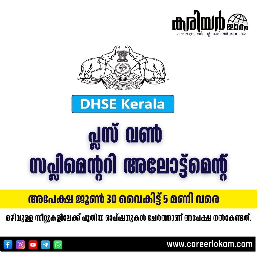 പ്ലസ് വൺ സപ്ലിമെൻ്ററി അലോട്ട്മെൻ്റ്: അപേക്ഷ ഇന്ന് മുതൽ ജൂൺ 30 വരെ