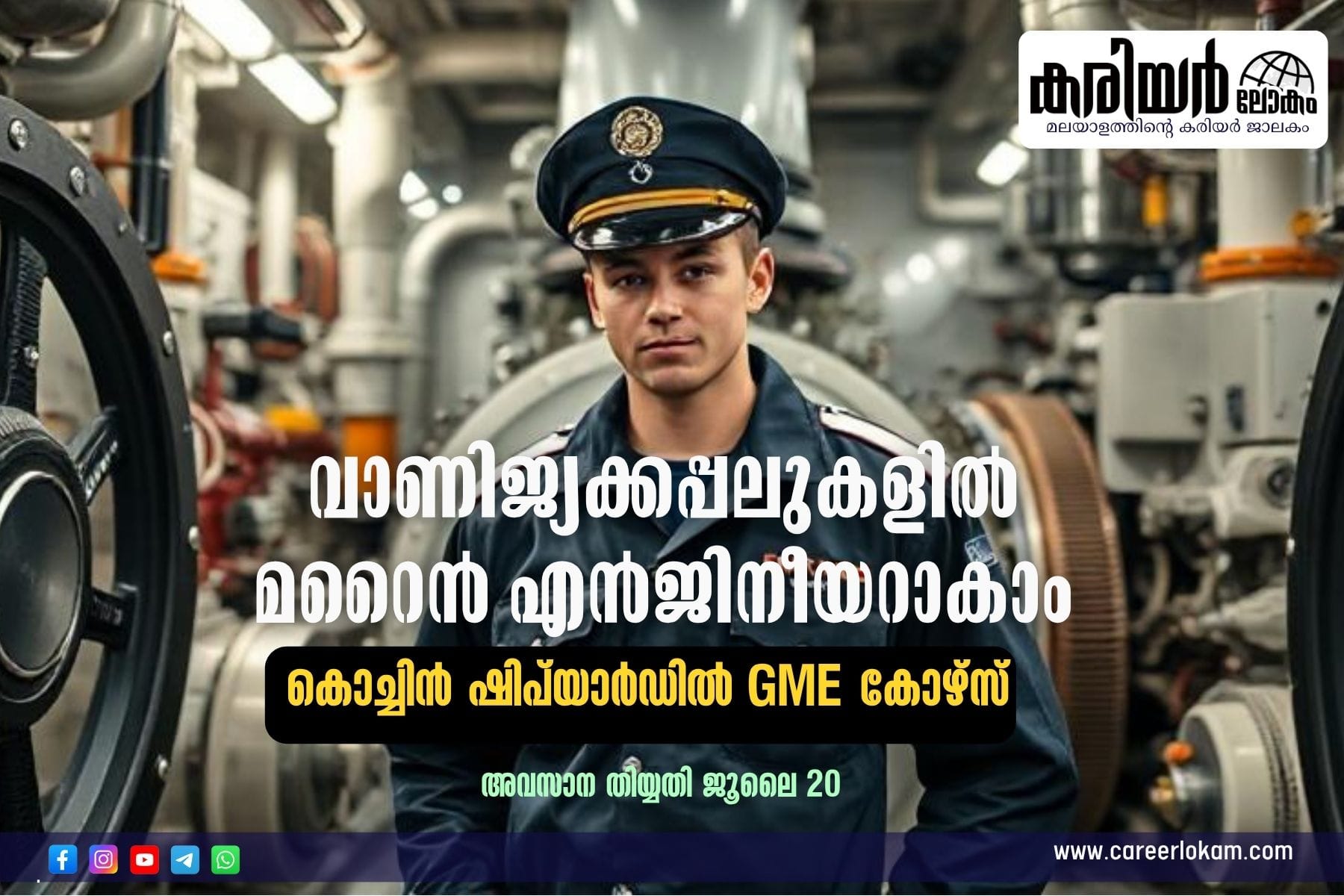 കൊച്ചിൻ ഷിപ്യാർഡിൻ്റെ മറൈൻ എൻജിനീയറിങ് ട്രെയിനിങ് ഇൻസ്റ്റിറ്റ്യൂട്ടിൽ 12 മാസത്തെ GME കോഴ്സിന് ജൂലൈ 20 വരെ അപേക്ഷിക്കാം. മെക്കാനിക്കൽ/മറൈൻ എൻജിനീയറിങ് ബിരുദധാരികൾക്ക് അവസരം.