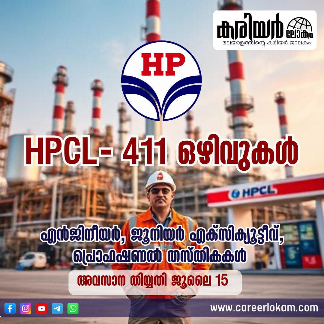 മഹാരത്ന കമ്പനിയായ ഹിന്ദുസ്ഥാൻ പെട്രോളിയം കോർപ്പറേഷൻ ലിമിറ്റഡിൽ (HPCL) 411 ഓഫീസർ, ജൂനിയർ എക്സിക്യൂട്ടീവ്, പ്രൊഫഷണൽ ഒഴിവുകൾ. വിവിധ എൻജിനീയറിങ്, ഡിപ്ലോമ, ബിരുദ യോഗ്യതയുള്ളവർക്ക് അപേക്ഷിക്കാം. ജൂലൈ 15 അവസാന തീയതി.