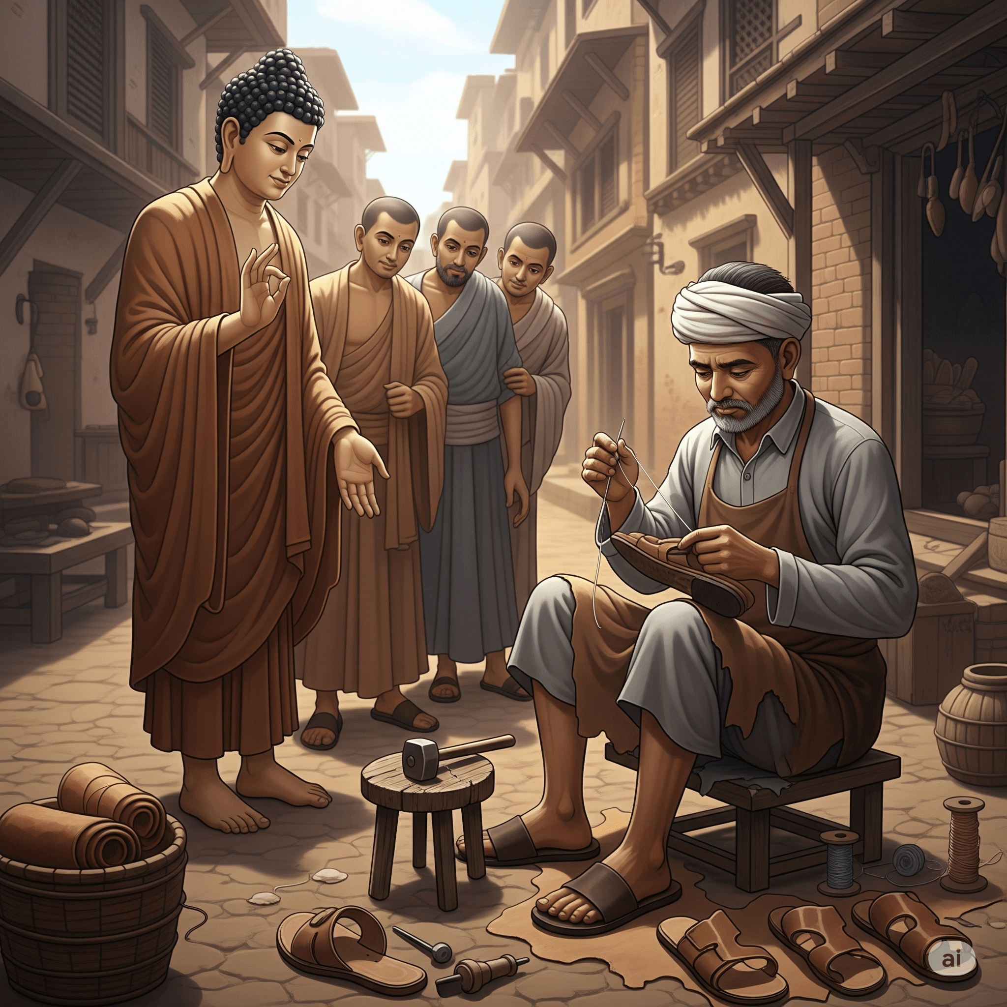ഒരു ദിവസം ബുദ്ധൻ തന്റെ ശിഷ്യരോട് ഒരു ചെരിപ്പുകുത്തിയെ ചൂണ്ടിക്കാട്ടി പറഞ്ഞു: “ഇയാളാണ് ശരിക്കും ഒരു ഗുരുവായിത്തീരേണ്ടത്.” ശിഷ്യന്മാർക്ക് അത്ഭുതമായി. “ചെരിപ്പുകുത്തിക്ക് എങ്ങനെയാണ് ഗുരുവാകാൻ കഴിയുക?” അവർ ചോദിച്ചു.