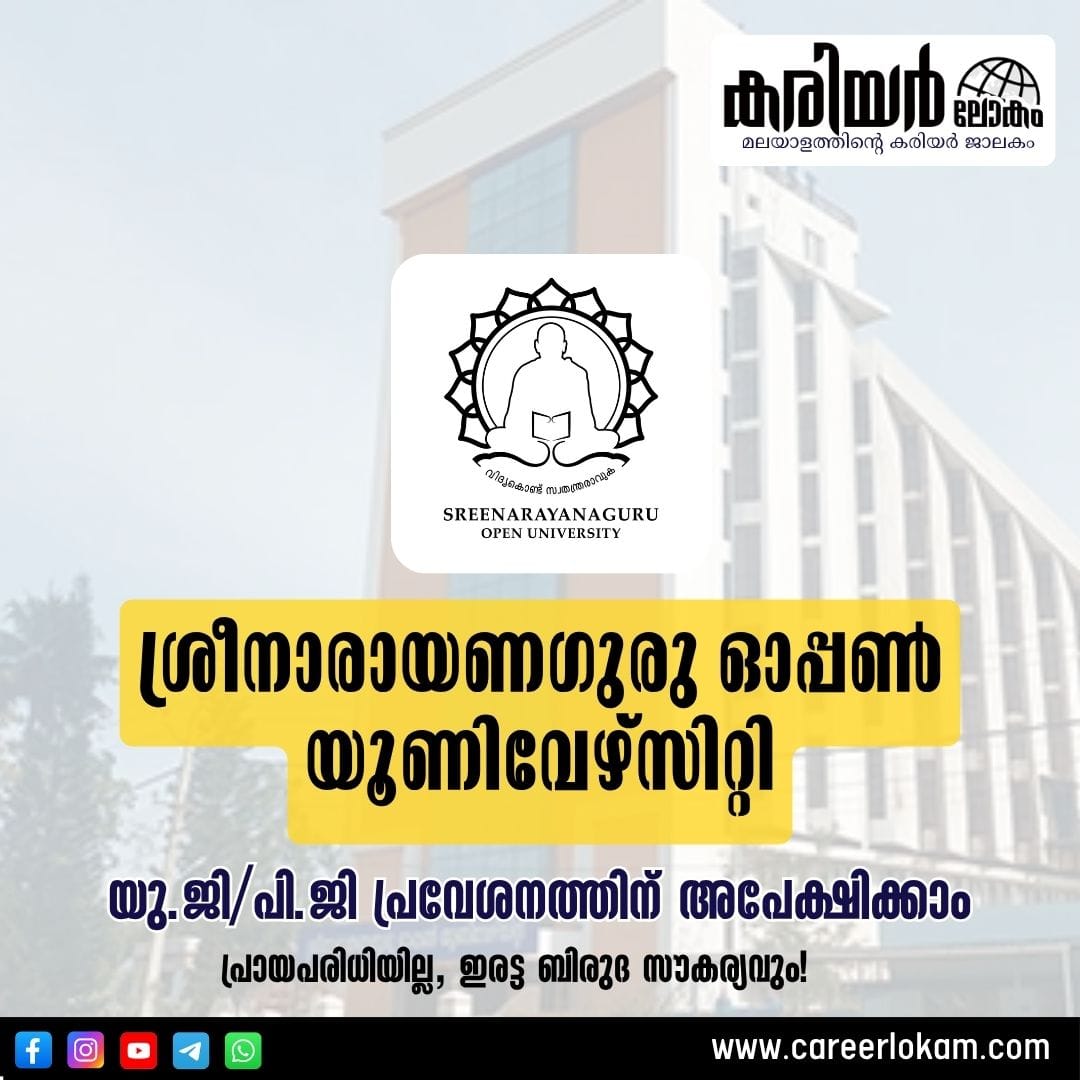 ശ്രീനാരായണഗുരു ഓപ്പൺ യൂണിവേഴ്സിറ്റിയിൽ ബിരുദ, ബിരുദാനന്തര കോഴ്സുകളിലേക്കും സർട്ടിഫിക്കറ്റ് പ്രോഗ്രാമുകളിലേക്കും പ്രവേശനം ആരംഭിച്ചു. 31 യു.ജി/പി.ജി പ്രോഗ്രാമുകളും 3 സർട്ടിഫിക്കറ്റ് പ്രോഗ്രാമുകളുമാണ് ഈ വർഷം വാഗ്ദാനം ചെയ്യുന്നത്. പ്രായപരിധിയില്ലാതെ പഠിക്കാൻ ആഗ്രഹിക്കുന്നവർക്കും ഒരേ സമയം രണ്ട് ബിരുദങ്ങൾ നേടാൻ താൽപ്പര്യമുള്ളവർക്കും ഇത് മികച്ച അവസരമാണ്. അപേക്ഷിക്കാനുള്ള അവസാന തീയതി 2025 സെപ്റ്റംബർ 10 ആണ്.