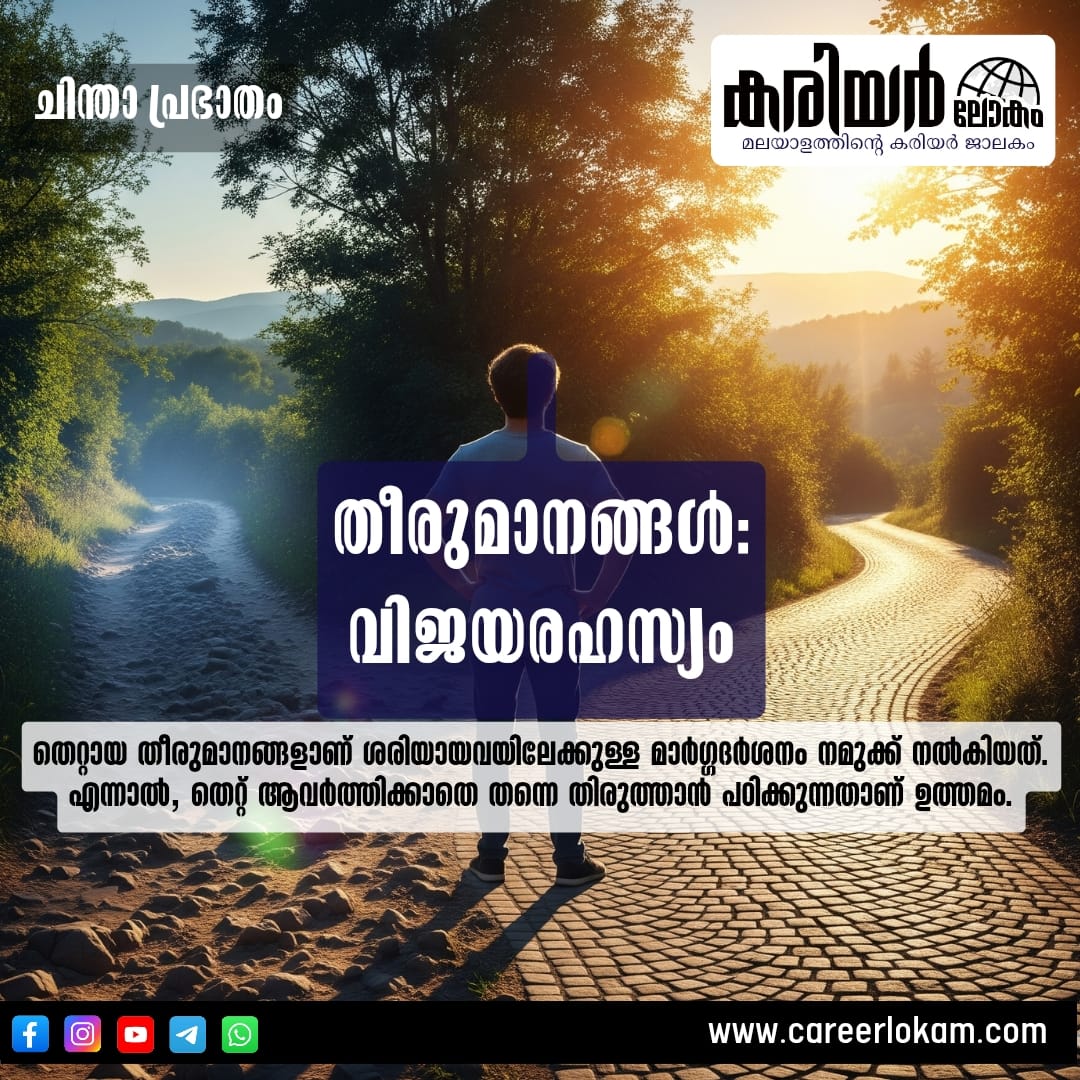 നമ്മുടെ ജീവിതത്തിൽ സംഭവിക്കുന്ന ഓരോ കാര്യവും അറിഞ്ഞോ അറിയാതെയോ നാം എടുക്കുന്ന തീരുമാനങ്ങളുടെ അനന്തര ഫലമായിരിക്കും. നേട്ടങ്ങളുടെ കൊടുമുടിയിൽ നിൽക്കുന്ന ആരുംതന്നെ ഒറ്റ ദിവസംകൊണ്ട് രൂപപ്പെട്ടവരല്ല. തെറ്റായ തീരുമാനങ്ങളുടെയും തിരുത്തിയെഴുതിയ നിലപാടുകളുടെയും ആകെത്തുകയാണ് ഓരോ ജീവിതവും.