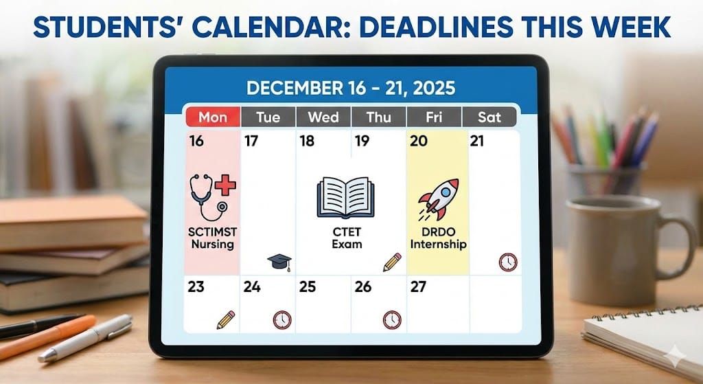 വിവിധ കോഴ്സുകളിലേക്കുള്ള പ്രവേശനം, അലോട്മെന്റ്, സ്കോളർഷിപ്പ് എന്നിവയുമായി ബന്ധപ്പെട്ട് ഈ ആഴ്ചയിലെ (ഡിസംബർ 16 – 21) പ്രധാന തീയതികൾ താഴെ നൽകുന്നു.