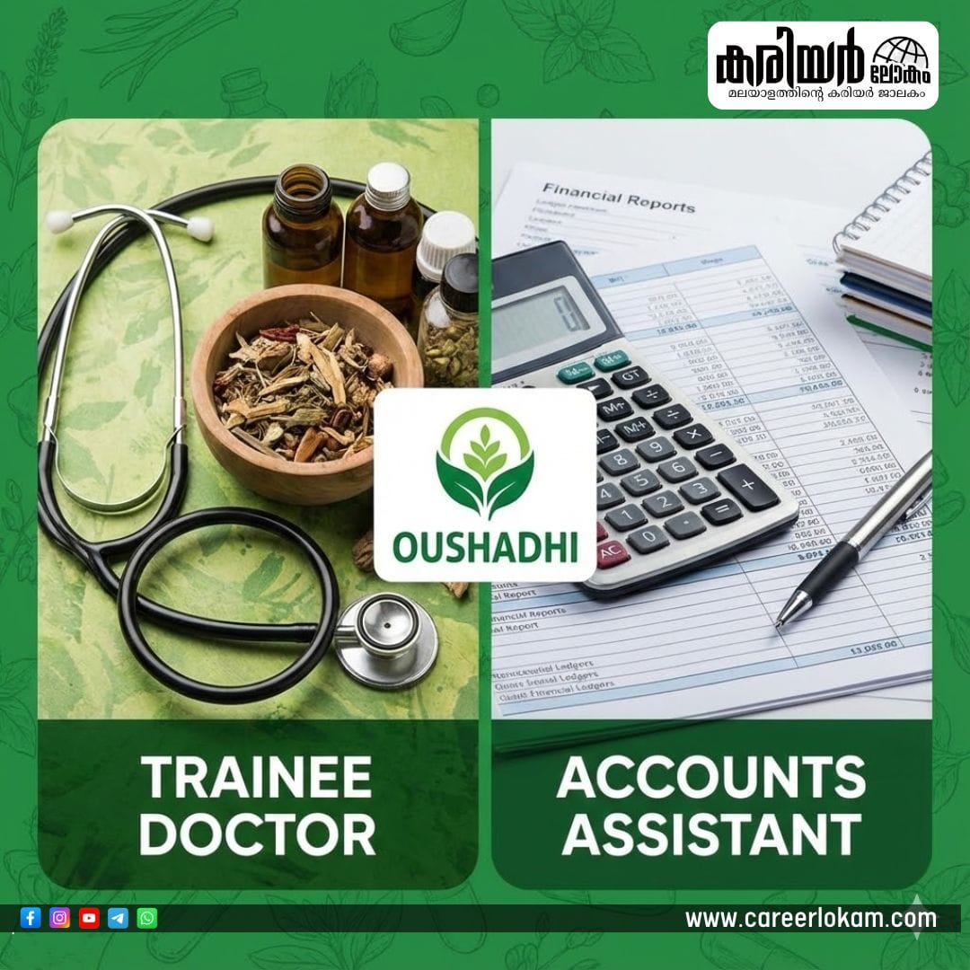 സംസ്ഥാന സർക്കാർ സ്ഥാപനമായ ഔഷധിയിൽ (The Pharmaceutical Corporation (IM) Kerala Ltd – Oushadhi) അക്കൗണ്ട്സ് അസിസ്റ്റന്റ്, ട്രെയിനി ഡോക്ടർ തസ്തികകളിലേക്ക് കരാർ അടിസ്ഥാനത്തിൽ നിയമനത്തിന് അപേക്ഷ ക്ഷണിച്ചു.