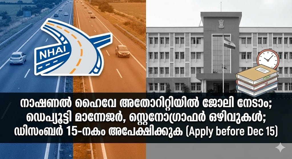 സർക്കാർ ഉദ്യോഗാർത്ഥികൾക്കായി രണ്ട് പ്രധാന തൊഴിൽ അറിയിപ്പുകൾ. നാഷണൽ ഹൈവേ അതോറിറ്റി ഓഫ് ഇന്ത്യയിലെ (NHAI) വിവിധ തസ്തികകളിലേക്കും, തിരുവനന്തപുരം വഞ്ചിയൂരിലെ സൈനിക റെസ്റ്റ് ഹൗസിലേക്കും അപേക്ഷ ക്ഷണിച്ചു. രണ്ടിടത്തും അപേക്ഷിക്കാനുള്ള അവസാന തീയതി 2025 ഡിസംബർ 15 ആണ്.