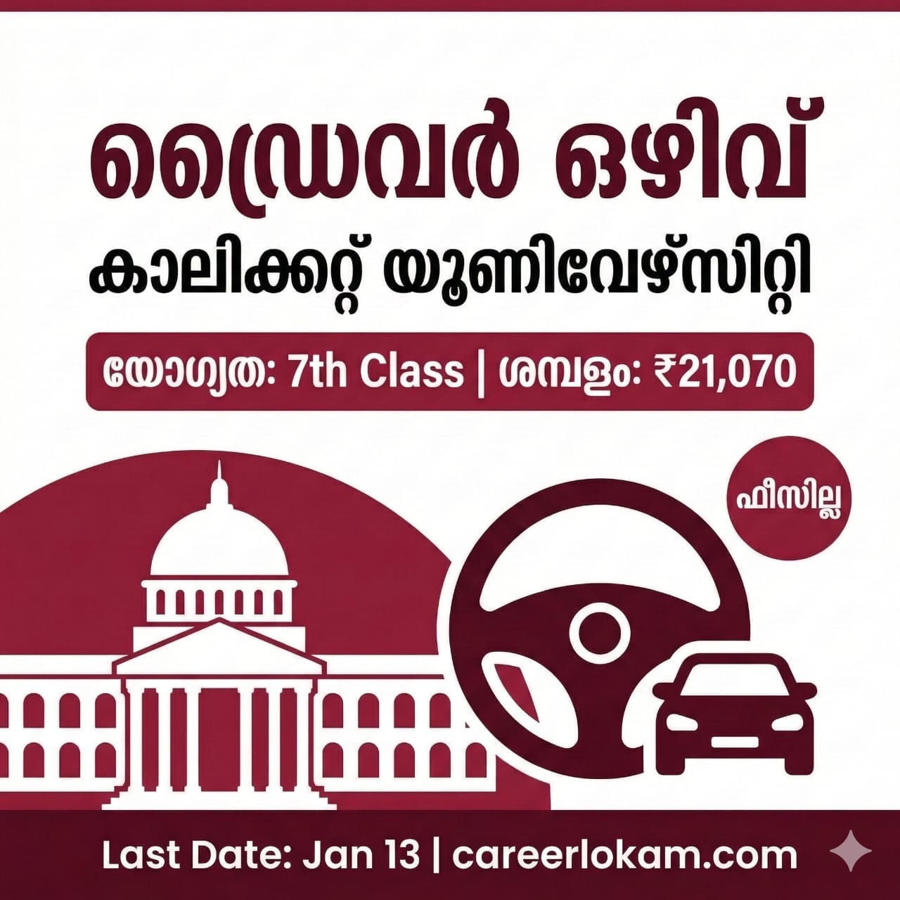 ഏഴാം ക്ലാസ് പാസായവർക്ക് അവസരം: സർവകലാശാലയിൽ ഡ്രൈവർ കം ഓഫീസ് അറ്റന്റന്റ്; ജനുവരി 13 വരെ അപേക്ഷിക്കാം