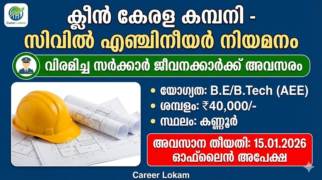 ക്ലീൻ കേരള കമ്പനിയിൽ സിവിൽ എഞ്ചിനീയർ ഒഴിവ്; വിരമിച്ചവർക്ക് അവസരം; ശമ്പളം 40,000 രൂപ
