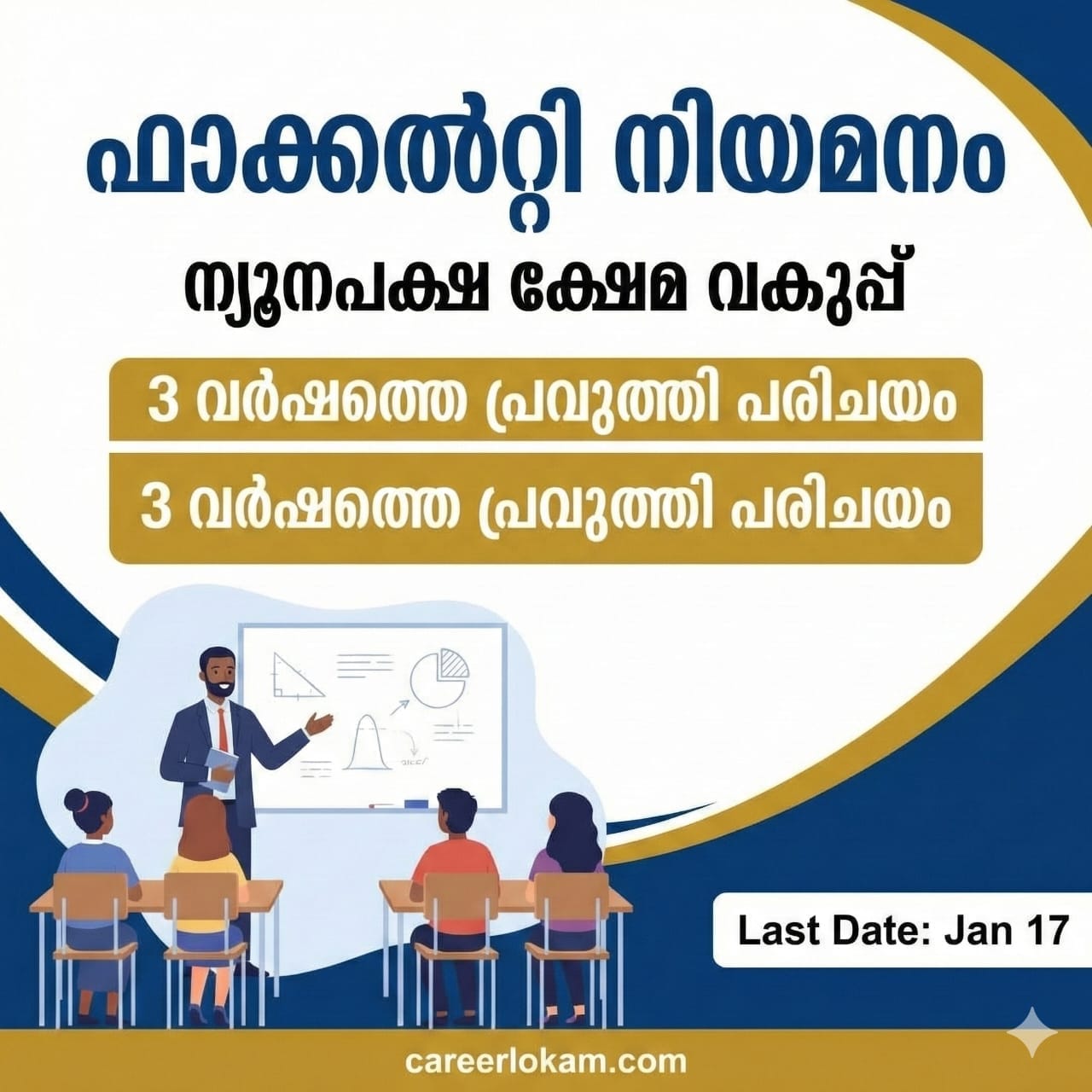- പ്രവൃത്തി പരിചയം: സർക്കാർ/സ്വകാര്യ സ്ഥാപനങ്ങളിൽ കുറഞ്ഞത് 3 വർഷത്തെ അധ്യാപന പരിചയം നിർബന്ധമാണ്.
