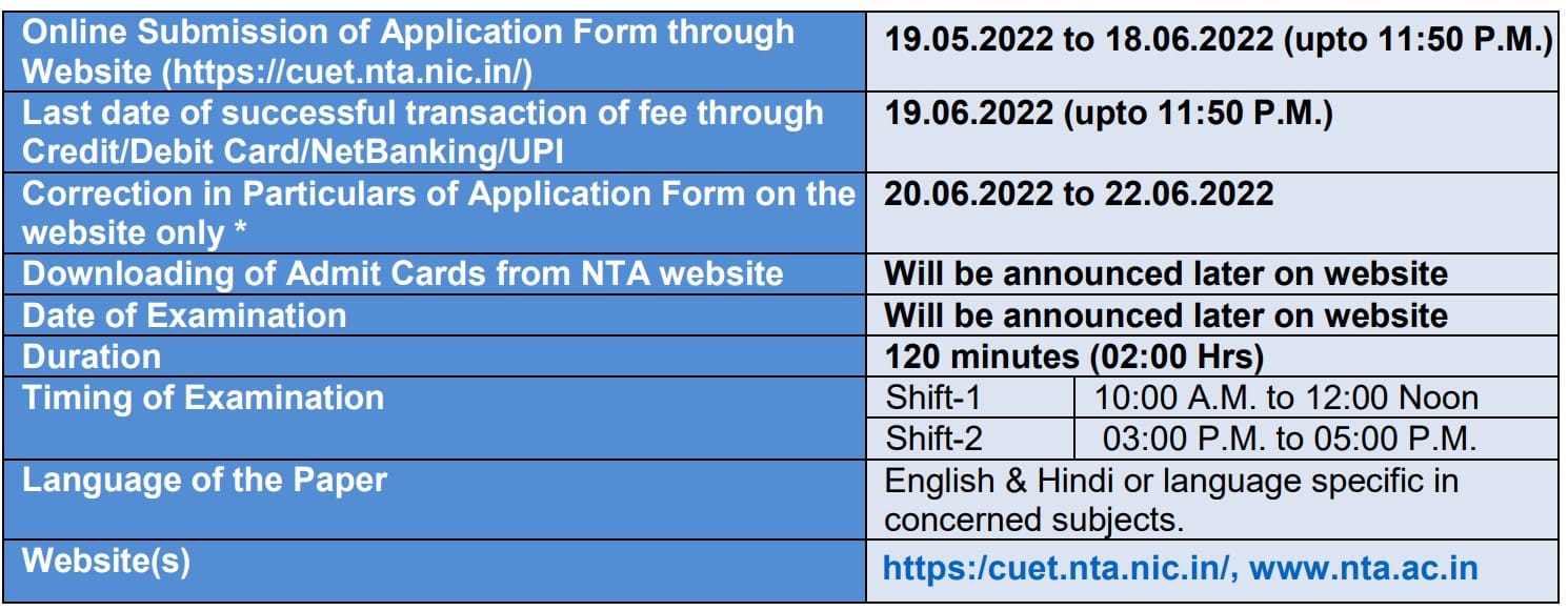 ഇംഗ്ലീഷ്, ഹിന്ദി, ആസാമീസ്, ബംഗാളി, ഗുജറാത്തി, കന്നഡ, മലയാളം, മറാഠി, ഒഡിയ, പഞ്ചാബി, തമിഴ്, തെലുങ്ക്, ഉറുദു എന്നിവയുൾപ്പെടെ 13 ഭാഷകളിൽ നാഷണൽ ടെസ്റ്റിംഗ് ഏജൻസി 2022 CUET പരീക്ഷ നടത്തും. ഇന്ത്യക്കകത്തെ 547 നഗരങ്ങളിലും ഇന്ത്യക്ക് പുറത്തുള്ള 13 നഗരങ്ങളിലും പ്രവേശന പരീക്ഷ നടക്കും