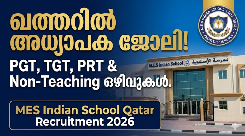 ഖത്തറിലെ ദോഹയിലുള്ള എം.ഇ.എസ് ഇന്ത്യൻ സ്കൂളിൽ അധ്യാപക, അനധ്യാപക ഒഴിവുകളിലേക്ക് MES Indian School Qatar Recruitment 2026 വിജ്ഞാപനം. വാലിഡ് ഖത്തർ ഐഡിയുള്ളവർക്ക് അപേക്ഷിക്കാം.
