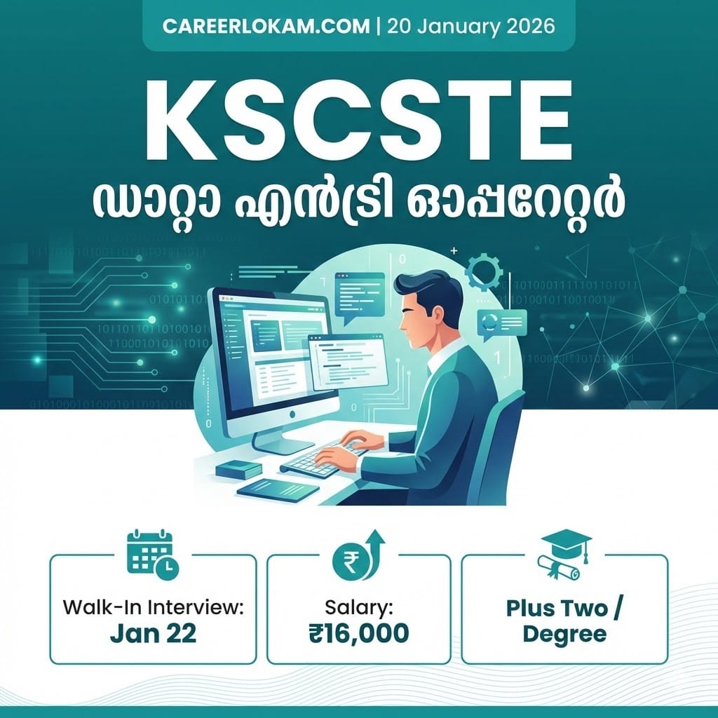 Read Moreകേരള സർക്കാരിന് കീഴിൽ പ്രവർത്തിക്കുന്ന പ്രമുഖ ശാസ്ത്ര ഗവേഷണ സ്ഥാപനമായ കേരള സ്റ്റേറ്റ് കൗൺസിൽ ഫോർ സയൻസ് ടെക്നോളജി ആൻഡ് എൻവയോൺമെന്റിൽ (KSCSTE) തൊഴിലവസരം. ഡാറ്റാ എൻട്രി