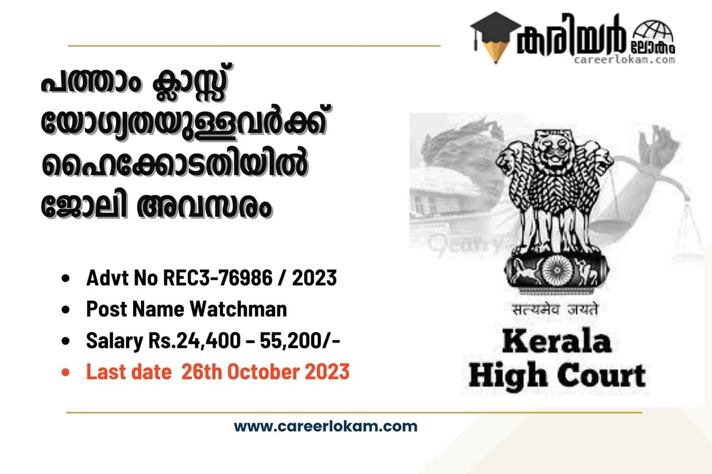 Read Moreകേരള ഹൈക്കോടതിയിൽ പത്താം ക്ലാസ്സ് യോഗ്യതയുള്ളവർക്ക് ജോലി അവസരം. Kerala High Court Watchman തസ്തികയിലേക്ക് നിയമനം നടത്തുന്നതിനു വേണ്ടി യോഗ്യരായ ഉദ്യോഗാർഥികളിൽ നിന്നും അപേക്ഷ ക്ഷണിച്ചു.