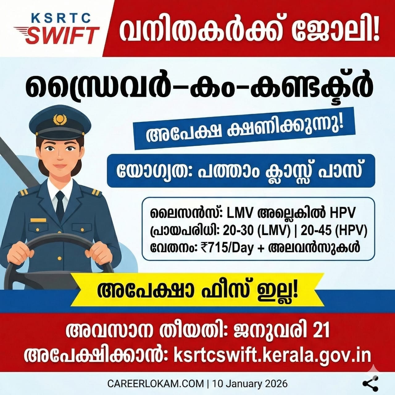 കേരള സ്റ്റേറ്റ് റോഡ് ട്രാൻസ്പോർട്ട് കോർപ്പറേഷന്റെ (KSRTC) സ്വിഫ്റ്റ് സർവീസുകളിലേക്ക് വനിതാ ഡ്രൈവർ-കം-കണ്ടക്ടർ (Women Driver-cum-Conductor) തസ്തികയിലേക്ക് അപേക്ഷ ക്ഷണിച്ചു. യോഗ്യരായ വനിതാ ഉദ്യോഗാർത്ഥികൾക്ക് ജനുവരി 21
