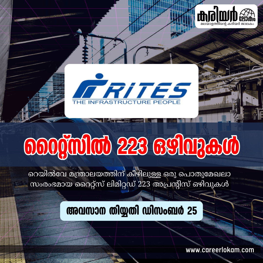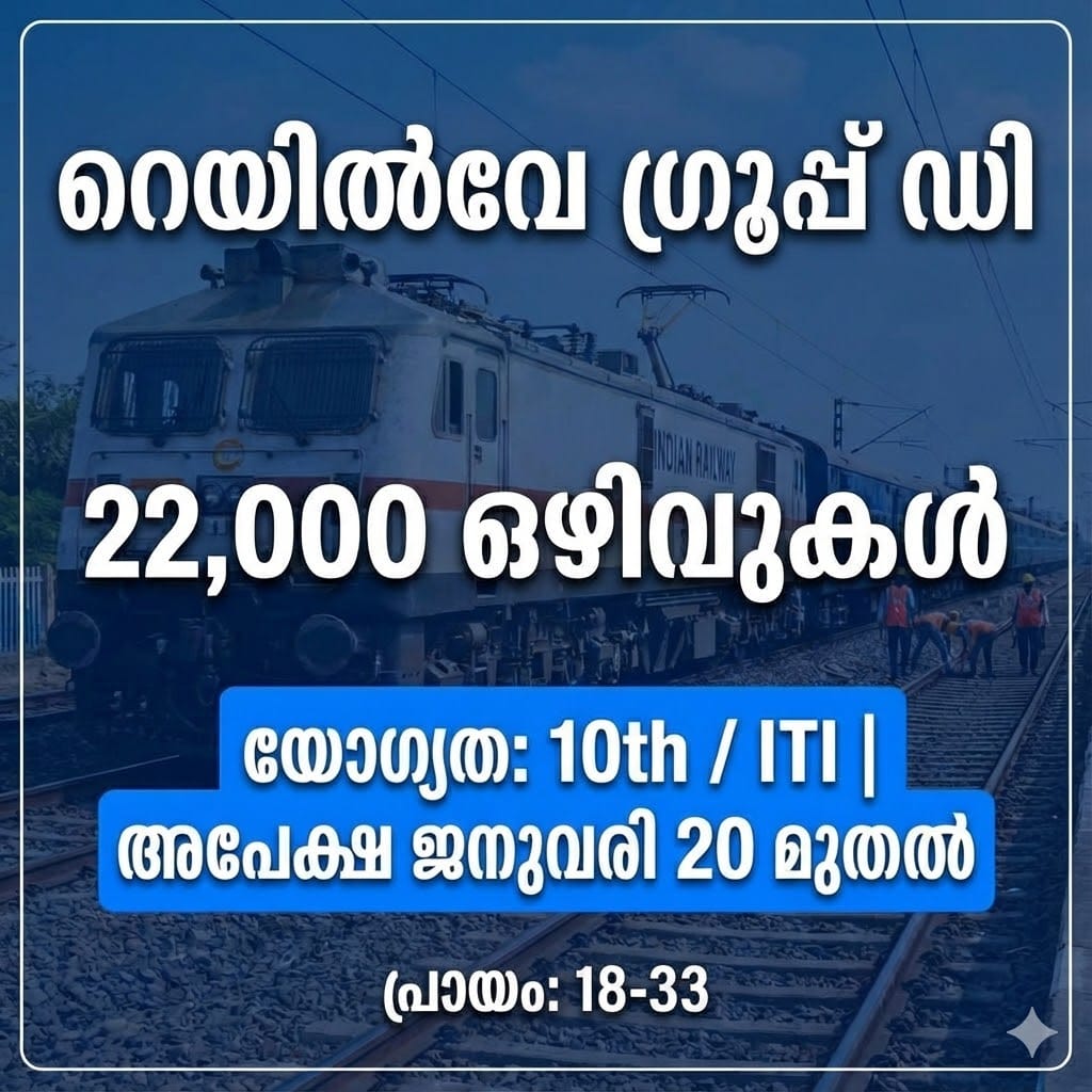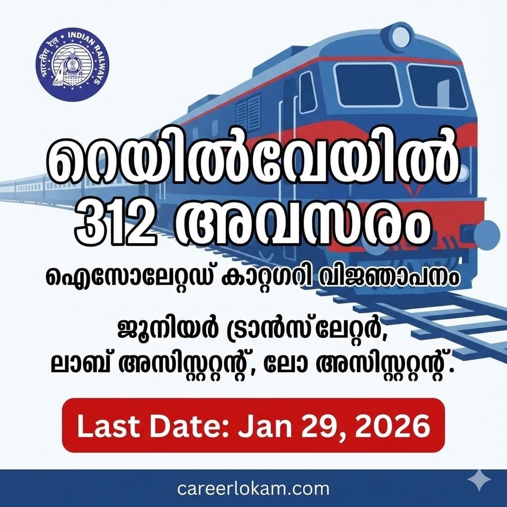 ഇന്ത്യൻ റെയിൽവേയിലെ വിവിധ ഐസൊലേറ്റഡ് കാറ്റഗറി (Isolated Category) തസ്തികകളിലായി 312 ഒഴിവുകളിലേക്ക് റെയിൽവേ റിക്രൂട്ട്മെന്റ് ബോർഡ് (RRB) അപേക്ഷ ക്ഷണിച്ചു. രാജ്യത്തെ വിവിധ ആർ.ആർ.ബി.കൾ വഴിയാണ്