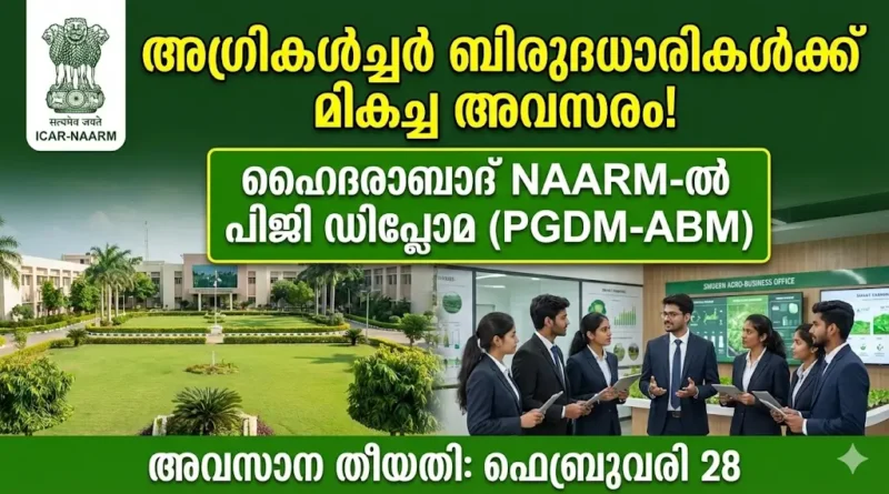 കാർഷിക മേഖലയിലും അനുബന്ധ ശാസ്ത്ര ശാഖകളിലും ബിരുദം പൂർത്തിയാക്കിയ വിദ്യാർത്ഥികൾക്ക് ബിസിനസ്സ് മാനേജ്മെന്റ് രംഗത്തേക്ക് ചുവടുവെക്കാൻ ലഭിക്കുന്ന ഏറ്റവും മികച്ച അവസരമാണ് ഇപ്പോൾ വന്നിരിക്കുന്നത്. ഇന്ത്യൻ കൗൺസിൽ ഓഫ് അഗ്രികൾച്ചറൽ റിസർച്ചിന്റെ (ICAR) കീഴിൽ ഹൈദരാബാദിൽ പ്രവർത്തിക്കുന്ന പ്രശസ്തമായ നാഷണൽ അക്കാദമി ഓഫ് അഗ്രികൾച്ചറൽ റിസർച്ച് മാനേജ്മെന്റിൽ (NAARM) പുതിയ അധ്യയന വർഷത്തേക്കുള്ള അഡ്മിഷൻ ആരംഭിച്ചു. NAARM PG Diploma Admission 2026 വിജ്ഞാപനം ഇപ്പോൾ ഔദ്യോഗികമായി പുറത്തിറക്കിയിരിക്കുകയാണ്. 2026-28 അധ്യയന വർഷത്തേക്കുള്ള പോസ്റ്റ് ഗ്രാജ്വേറ്റ് ഡിപ്ലോമ ഇൻ മാനേജ്മെന്റ് – അഗ്രി ബിസിനസ് മാനേജ്മെന്റ് (PGDM-ABM) പ്രോഗ്രാമിലേക്കാണ് വിദ്യാർത്ഥികളിൽ നിന്നും അപേക്ഷകൾ ക്ഷണിച്ചിരിക്കുന്നത്. മികച്ച അക്കാദമിക് പശ്ചാത്തലവും നൂറു ശതമാനം ക്യാമ്പസ് പ്ലേസ്മെന്റും ഉറപ്പുനൽകുന്ന ഈ കോഴ്സിലേക്ക് പ്രവേശനം നേടുക എന്നത് ഏതൊരു അഗ്രികൾച്ചർ ബിരുദധാരിയുടെയും വലിയ സ്വപ്നമാണ്. ഈ NAARM PG Diploma Admission 2026 യെക്കുറിച്ചുള്ള പൂർണ്ണ വിവരങ്ങൾ, യോഗ്യതകൾ, തിരഞ്ഞെടുപ്പ് രീതി, അപേക്ഷാ തീയതി എന്നിവ ഈ ലേഖനത്തിൽ വളരെ വിശദമായി നൽകുന്നു.