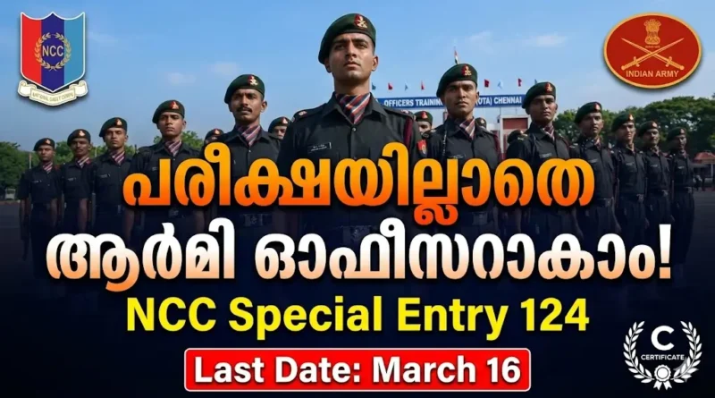 രാജ്യസേവനം സ്വപ്നം കാണുന്ന എൻ.സി.സി കേഡറ്റുകൾക്ക് ഇതാ മികച്ച അവസരം. NCC Special Entry 124 Course (Oct 2026) വിജ്ഞാപനം ഇന്ത്യൻ ആർമി പുറത്തിറക്കി. ഷോർട്ട് സർവീസ് കമ്മീഷൻ (SSC) വഴി ഓഫീസറാകാൻ സഹായിക്കുന്ന ഈ എൻട്രിയിലേക്ക് പുരുഷന്മാർക്കും സ്ത്രീകൾക്കും അപേക്ഷിക്കാം. എഴുത്തുപരീക്ഷയില്ലാതെ, നേരിട്ട് എസ്.എസ്.ബി (SSB) ഇന്റർവ്യൂ വഴിയാണ് തിരഞ്ഞെടുപ്പ്. ചെന്നൈയിലെ ഓഫീസേഴ്സ് ട്രെയിനിംഗ് അക്കാദമിയിൽ (OTA) 49 ആഴ്ചത്തെ പരിശീലനത്തിന് ശേഷം ലെഫ്റ്റനന്റ് പദവിയിൽ ജോലിയിൽ പ്രവേശിക്കാം. മാർച്ച് 16 വരെ ഓൺലൈനായി അപേക്ഷിക്കാം.